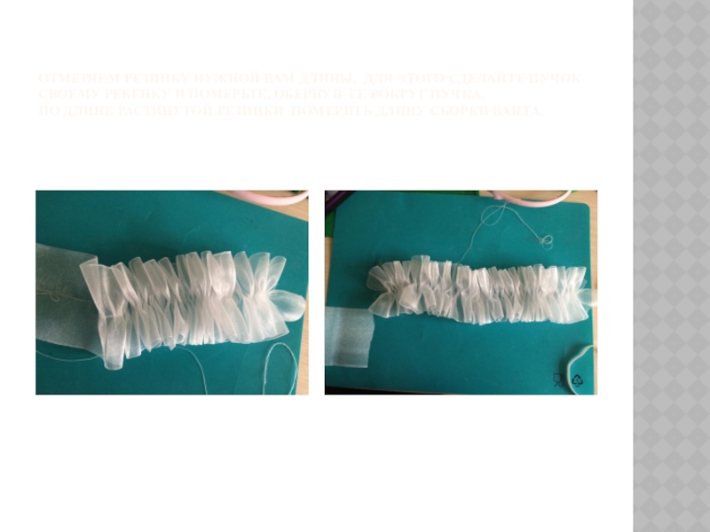 Слайд 6Отмеряем резинку нужной вам длины. Для этого сделайте пучок своему ребенку