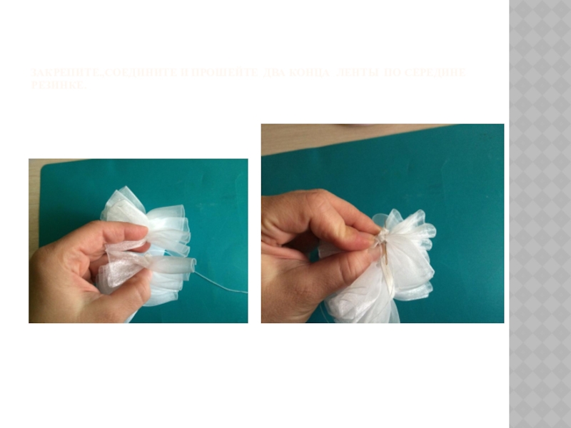 Слайд 9Закрепите.,Соедините и прошейте два конца ленты по середине резинке.