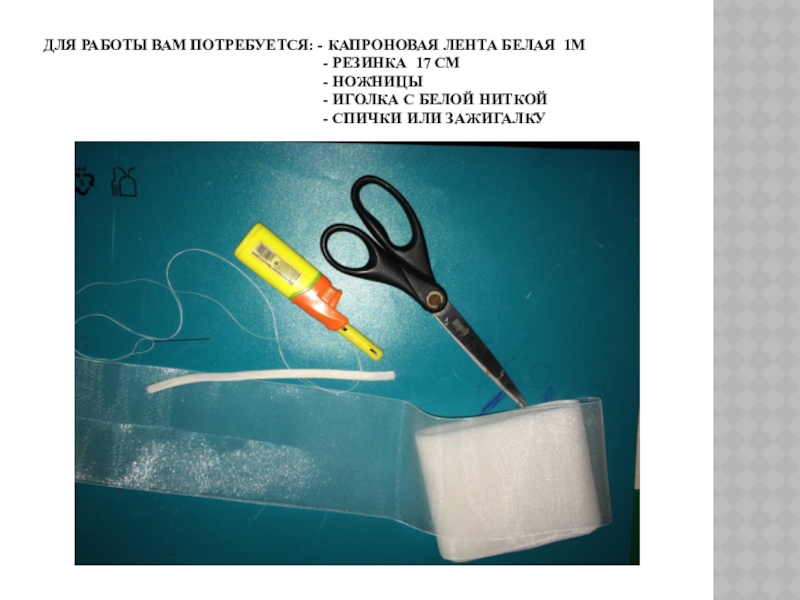 Слайд 2Для работы вам потребуется: - капроновая лента белая 1м