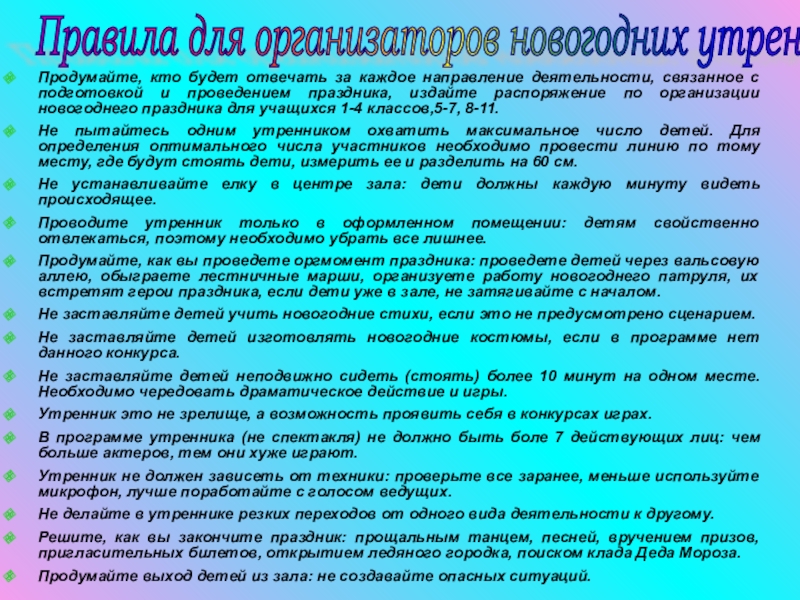 и проведением праздника, издайте распоряжение по организации новогоднего праздника для учащихся 1-4 классов,5-7, 8-11.