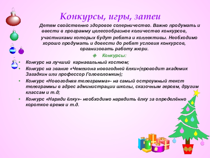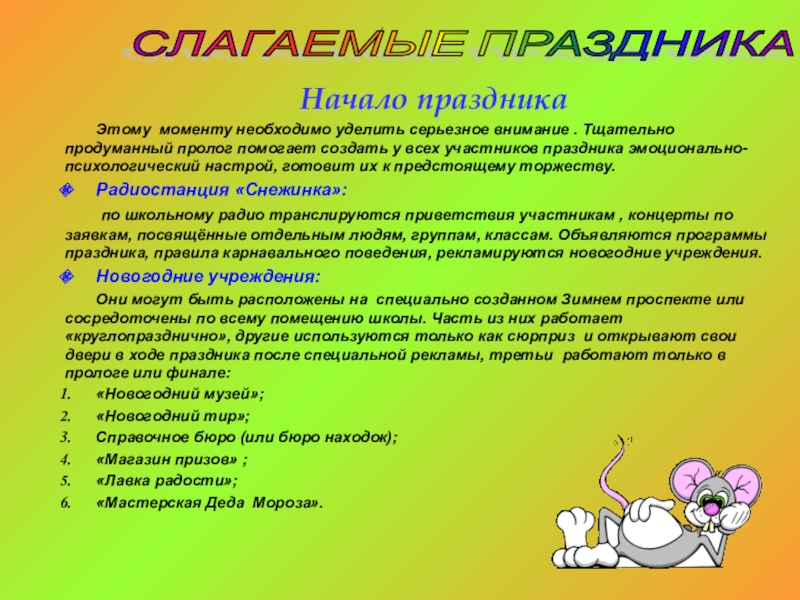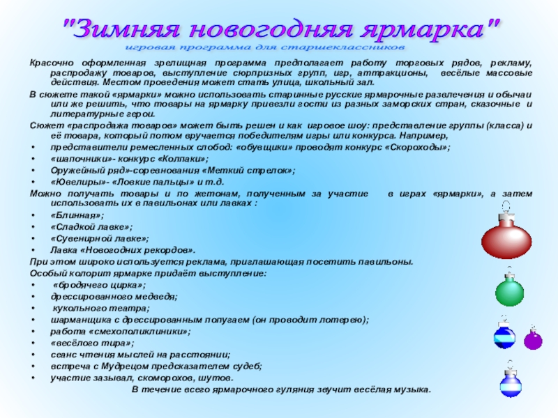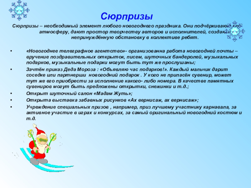 Решите, как вы закончите праздник: прощальным танцем, песней, вручением призов, пригласительных билетов, открытием ледяного городка, поиском клада Деда Мороза.