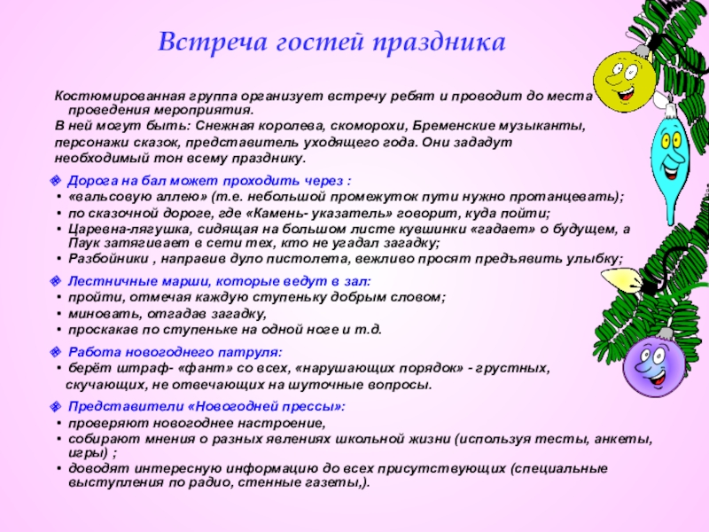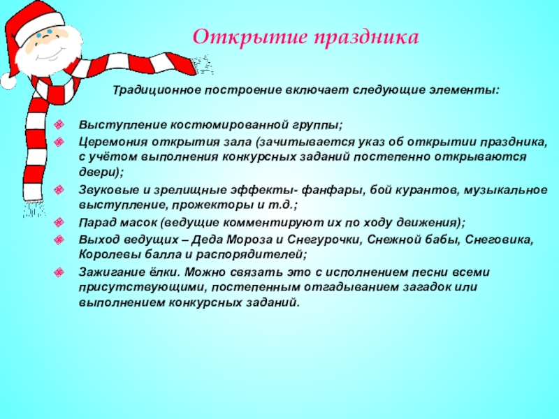 Продумайте, как вы проведете оргмомент праздника: проведете детей через вальсовую аллею, обыграете лестничные марши, организуете работу новогоднего патруля, их встретят герои праздника, если дети уже в зале, не затягивайте с началом.