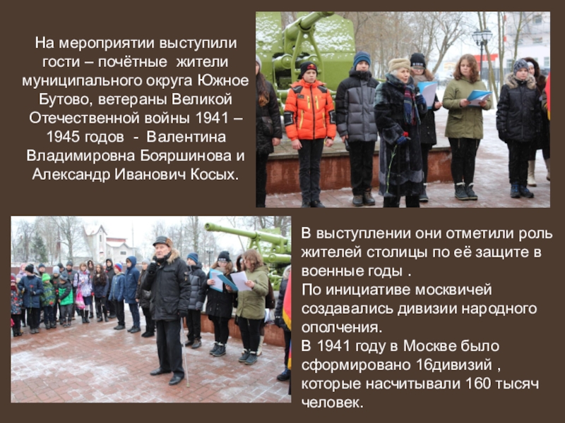 В выступлении они отметили роль жителей столицы по её защите в военные годы .