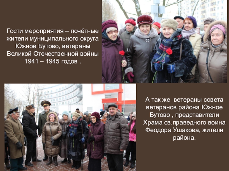 А так же ветераны совета ветеранов района Южное Бутово , представители Храма св.праведного воина Феодора Ушакова, жители района.