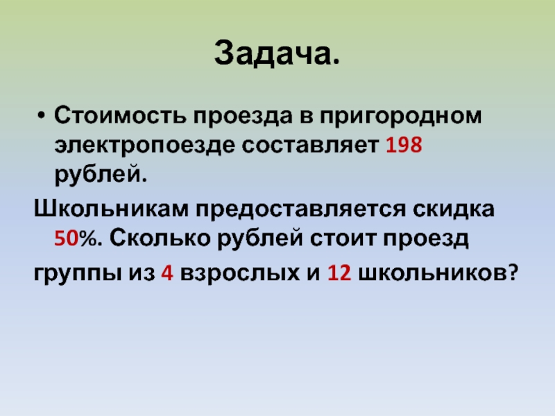 Задача.Стоимость проезда в пригородном электропоезде составляет 198 рублей.Школьникам предоставляется скидка 50%. Сколько рублей стоит проездгруппы из 4