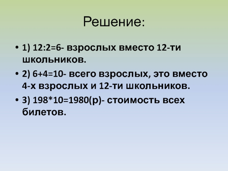 Решение:1) 12:2=6- взрослых вместо 12-ти школьников.2) 6+4=10- всего взрослых, это вместо 4-х взрослых и 12-ти школьников.3) 198*10=1980(р)-