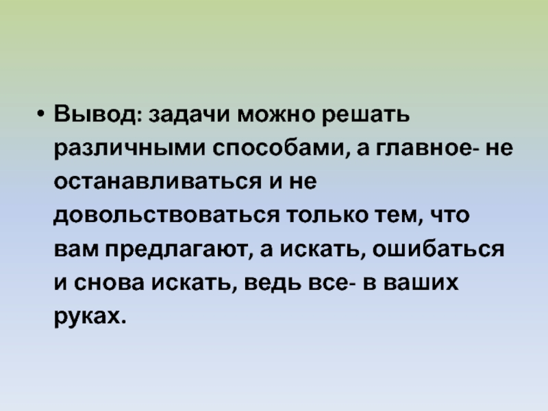 Слайд 9Вывод: задачи можно решать различными способами, а главное- не останавливаться и