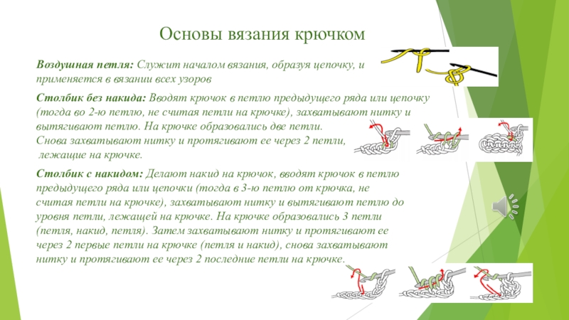 Столбик без накида: Вводят крючок в петлю предыдущего ряда или цепочку (тогда во 2-ю петлю, не считая петли на крючке), захватывают нитку и вытягивают петлю. На крючке образовались две петли.