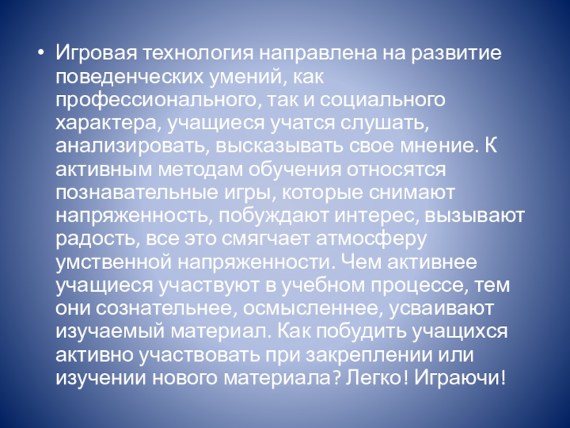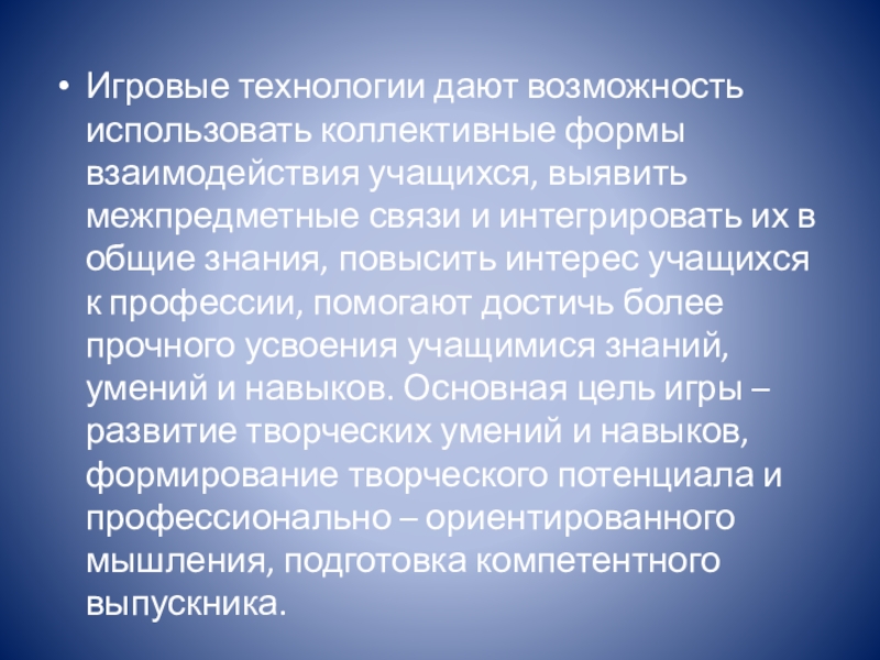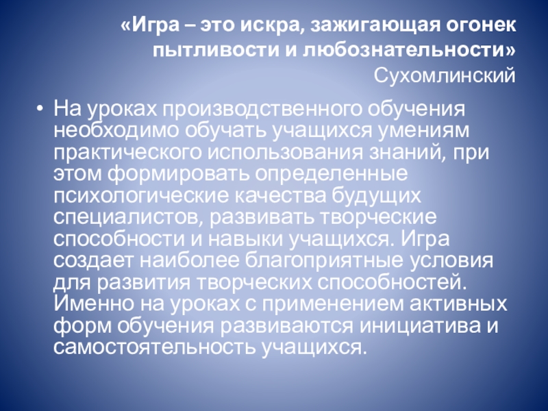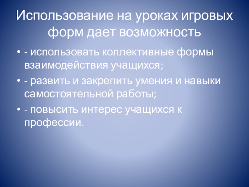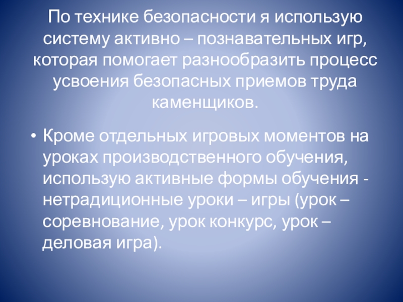 Кроме отдельных игровых моментов на уроках производственного обучения, использую активные формы обучения - нетрадиционные уроки – игры (урок – соревнование, урок конкурс, урок – деловая игра).