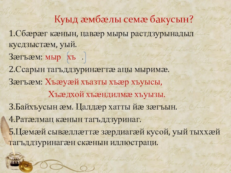 Куыд æмбæлы семæ бакусын? 1.Сбæрæг кæнын, цавæр мыры растдзурынадыл кусдзыстæм, уый. Зæгъæм: мыр  хъ  .2.Ссарын