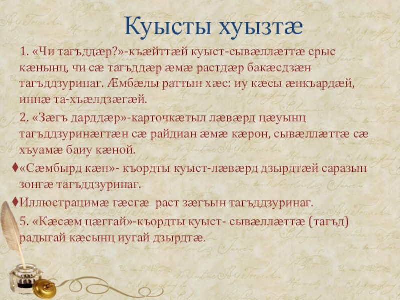 Слайд 13 Кæцы кары сывæллæттимæ кусын æмбæлы тагъддзуринæгтыл?