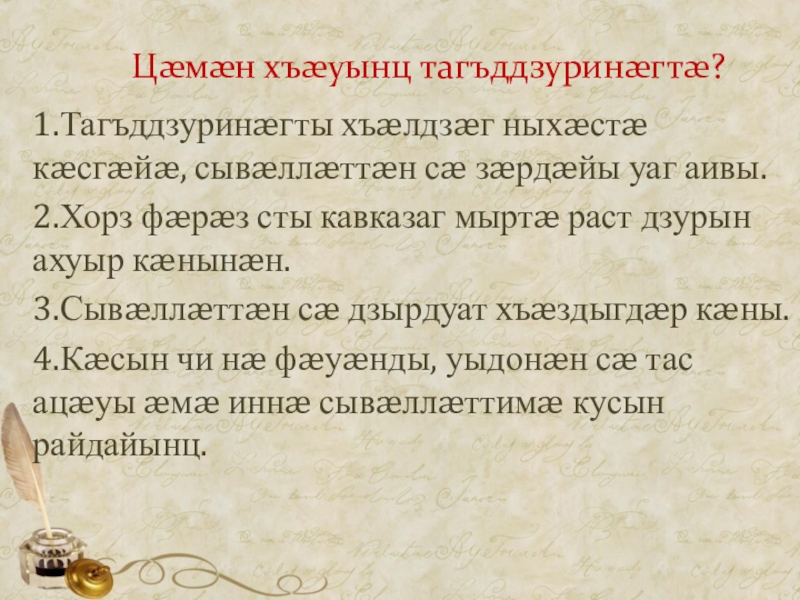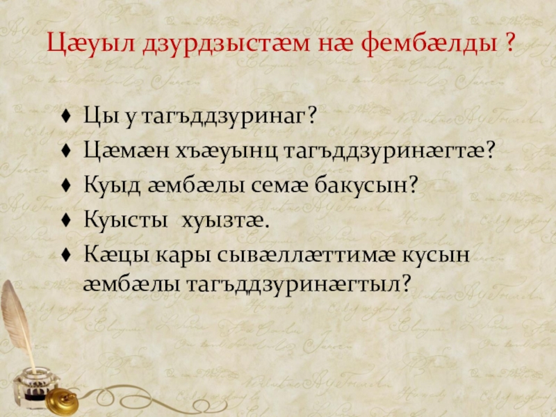 Слайд 3Цæуыл дзурдзыстæм нæ фембæлды ?