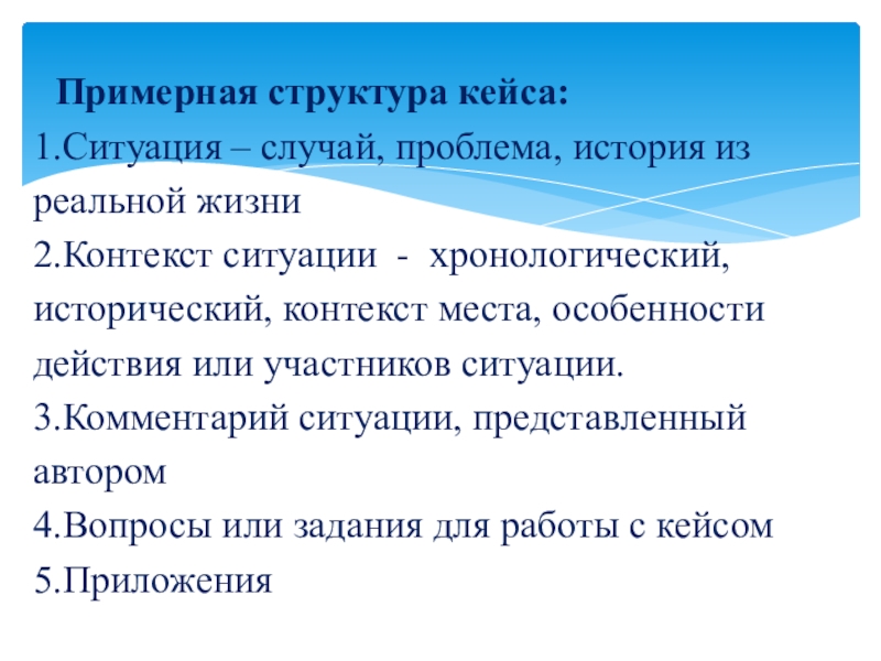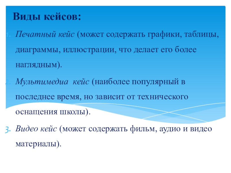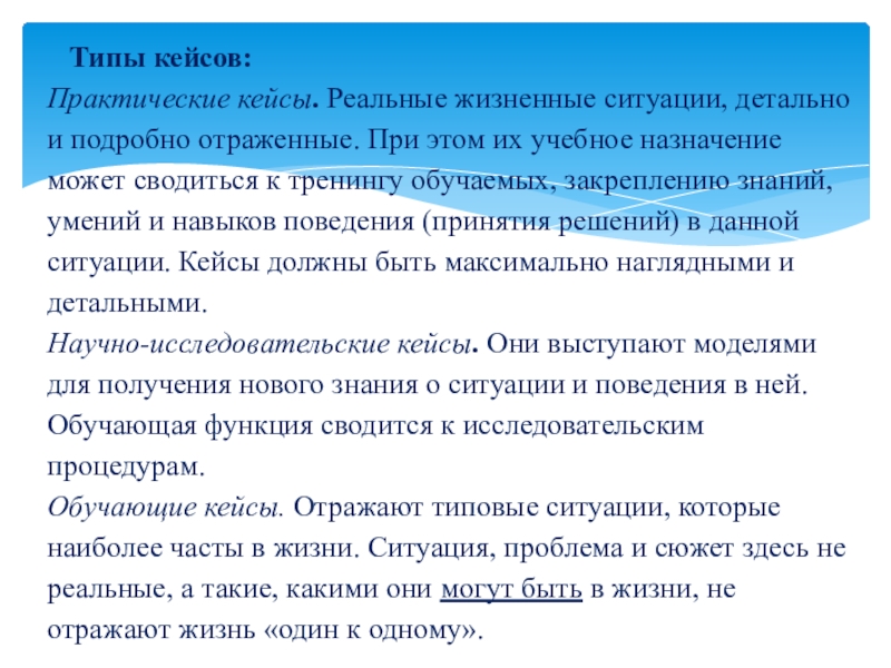 этом их учебное назначение может сводиться к тренингу обучаемых, закреплению знаний, умений и навыков поведения (принятия решений) в данной ситуации. Кейсы должны быть максимально наглядными и детальными.