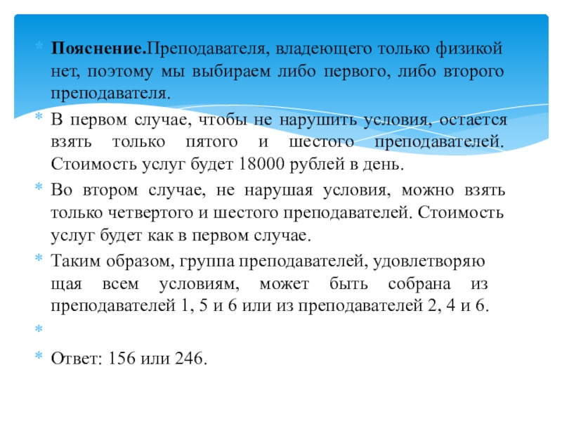 Слайд 13Пояснение.Преподавателя, владеющего только физикой нет, поэтому мы выбираем либо первого, либо
