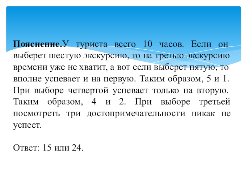 Слайд 15Пояснение.У туриста всего 10 часов. Если он выберет шестую экскурсию, то