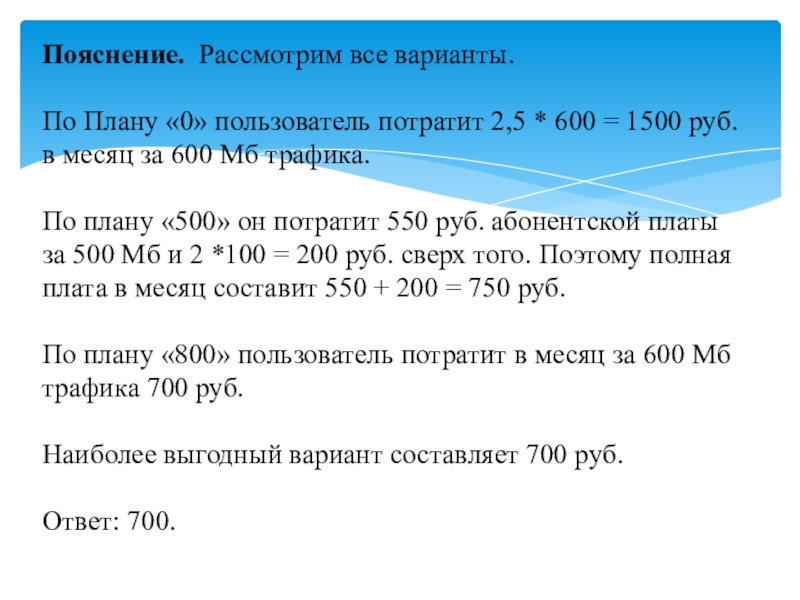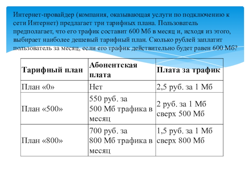 тарифных плана. Пользователь предполагает, что его трафик составит 600 Мб в месяц и, исходя из этого, выбирает наиболее дешевый тарифный план. Сколько рублей заплатит пользователь за месяц, если его трафик действительно будет равен 600 Мб?