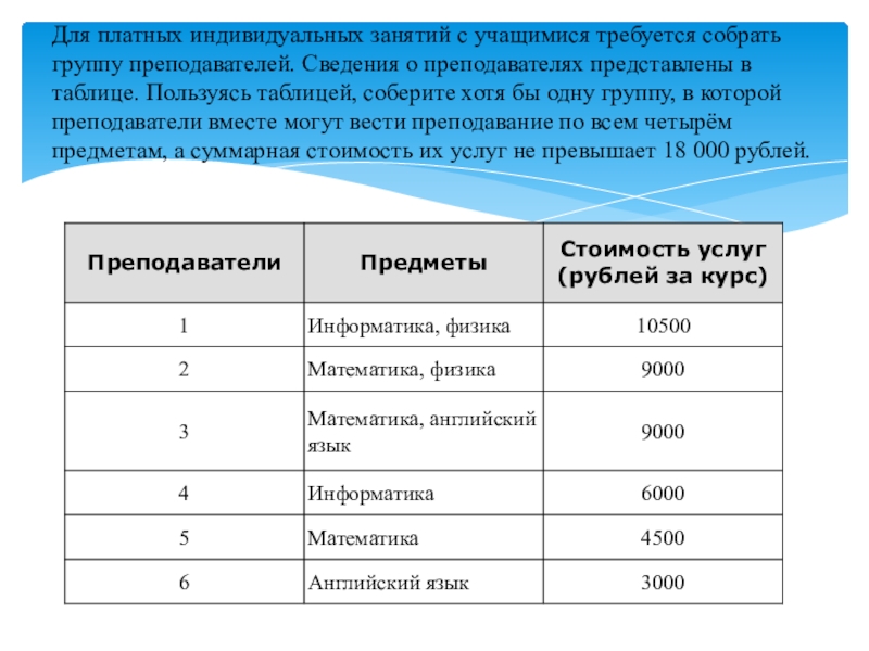 о преподавателях представлены в таблице. Пользуясь таблицей, соберите хотя бы одну группу, в которой преподаватели вместе могут вести преподавание по всем четырём предметам, а суммарная стоимость их услуг не превышает 18 000 рублей.