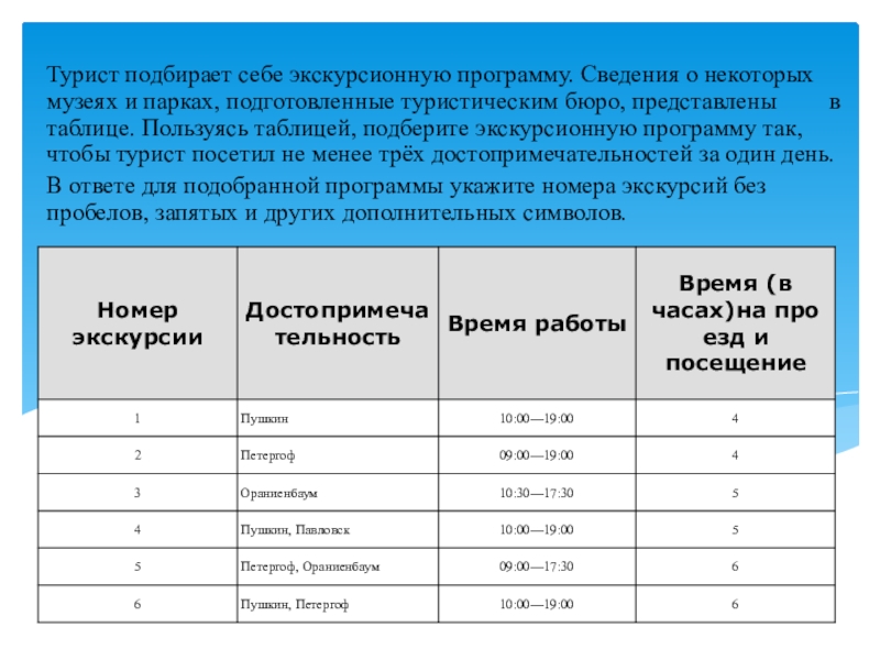 В ответе для подобранной программы укажите номера экскурсий без пробелов, запятых и других дополнительных символов.