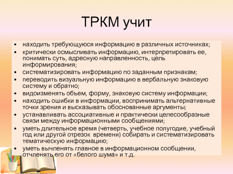 уметь вычленять главное в информационном сообщении, отчленять его от «белого шума» и т.д.