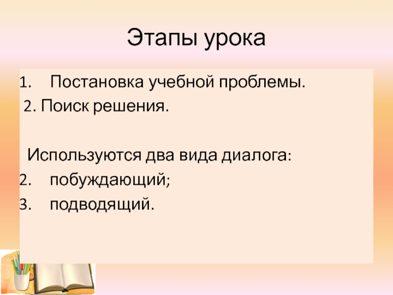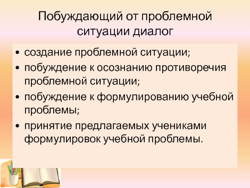 Слайд 19Побуждающий от проблемной ситуации диалог