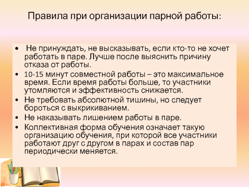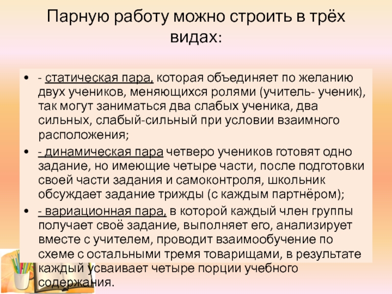 двух учеников, меняющихся ролями (учитель- ученик), так могут заниматься два слабых ученика, два сильных, слабый-сильный при условии взаимного расположения;