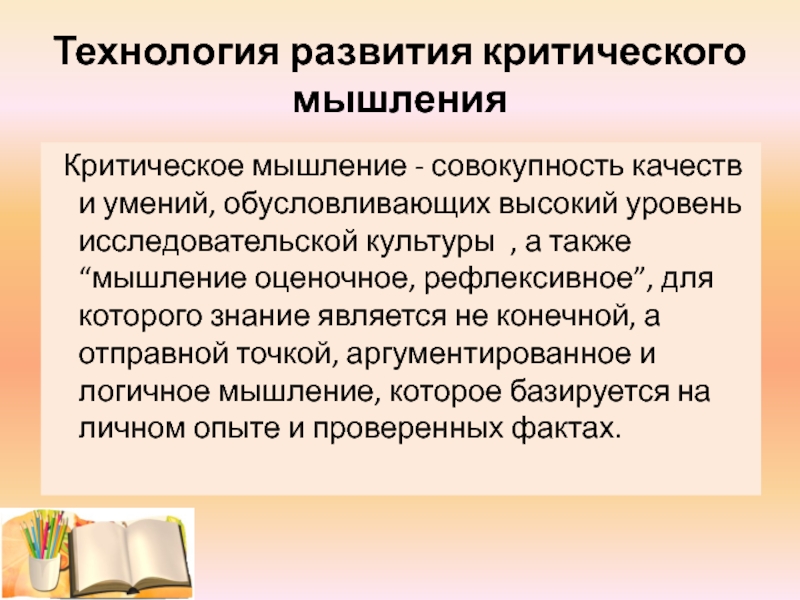 обусловливающих высокий уровень исследовательской культуры , а также “мышление оценочное, рефлексивное”, для которого знание является не конечной, а отправной точкой, аргументированное и логичное мышление, которое базируется на личном опыте и проверенных фактах.