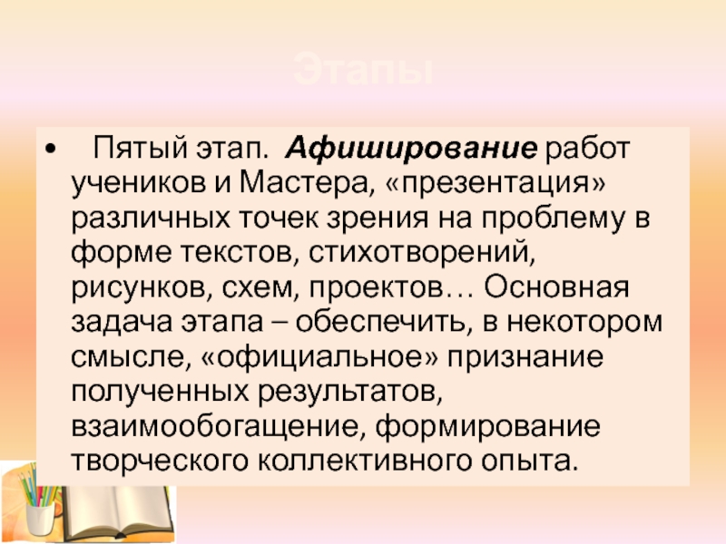 зрения на проблему в форме текстов, стихотворений, рисунков, схем, проектов… Основная задача этапа – обеспечить, в некотором смысле, «официальное» признание полученных результатов, взаимообогащение, формирование творческого коллективного опыта.