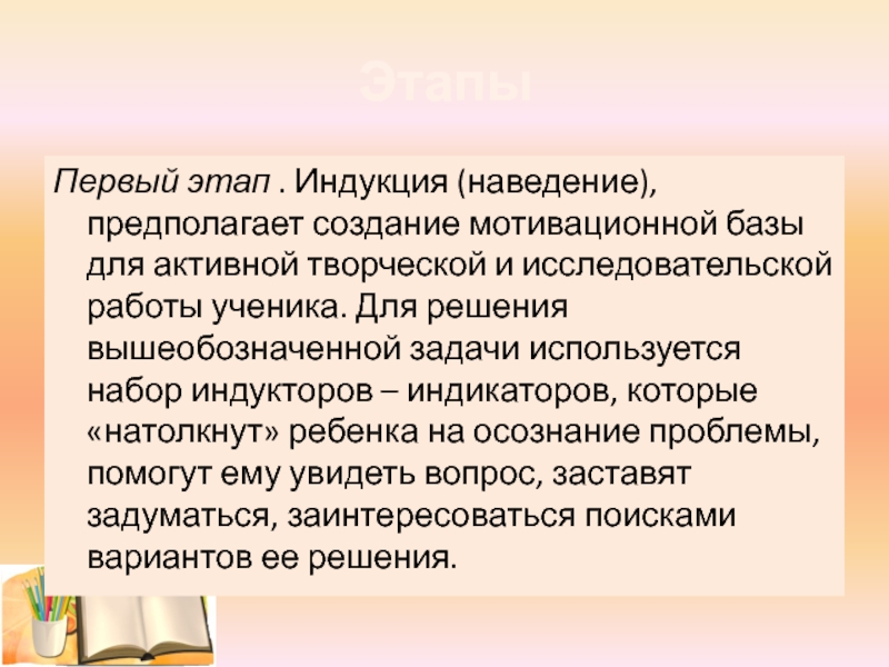 Первый этап . Индукция (наведение), предполагает создание мотивационной базы для активной творческой