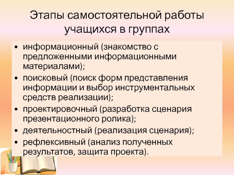 Слайд 16Этапы самостоятельной работы учащихся в группах