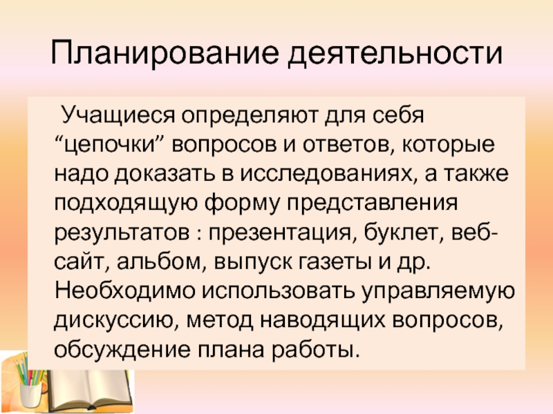 ответов, которые надо доказать в исследованиях, а также подходящую форму представления результатов : презентация, буклет, веб-сайт, альбом, выпуск газеты и др. Необходимо использовать управляемую дискуссию, метод наводящих вопросов, обсуждение плана работы.