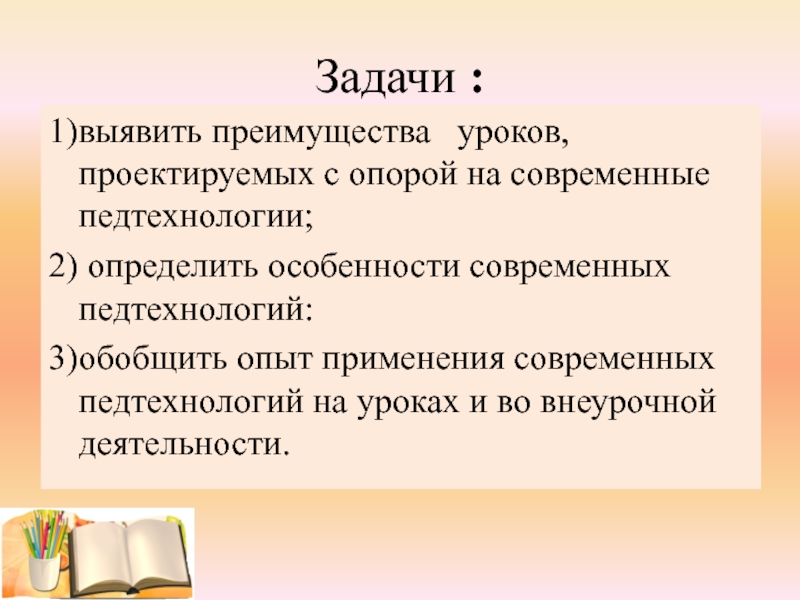 1)выявить преимущества уроков, проектируемых с опорой на современные педтехнологии;