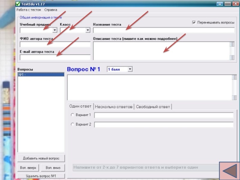 класс, предмет, название и описание теста