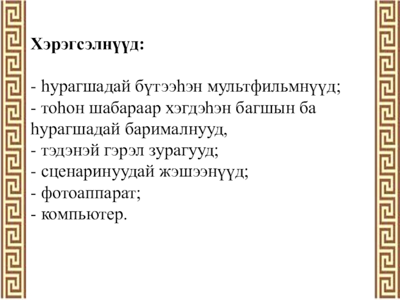 Слайд 4Хэрэгсэлнүүд: - һурагшадай бүтээһэн мультфильмнүүд; - тоһон шабараар хэгдэһэн багшын ба һурагшадай