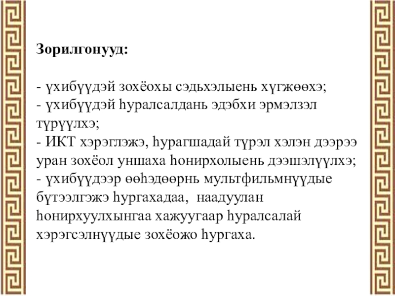 Слайд 3Зорилгонууд: - үхибүүдэй зохёохы сэдьхэлыень хүгжөөхэ; - үхибүүдэй һуралсалдань эдэбхи эрмэлзэл түрүүлхэ; - ИКТ