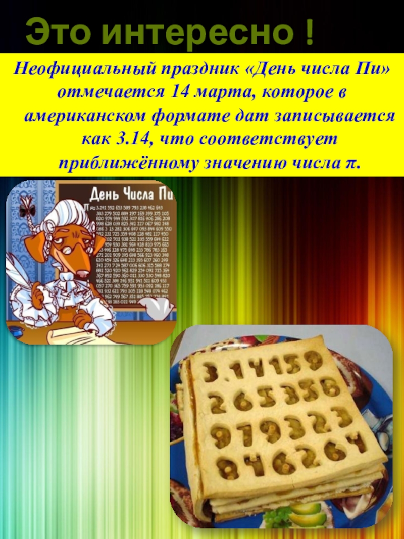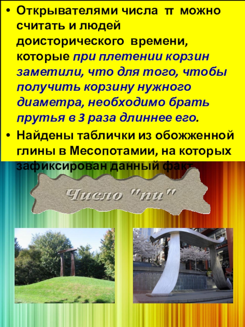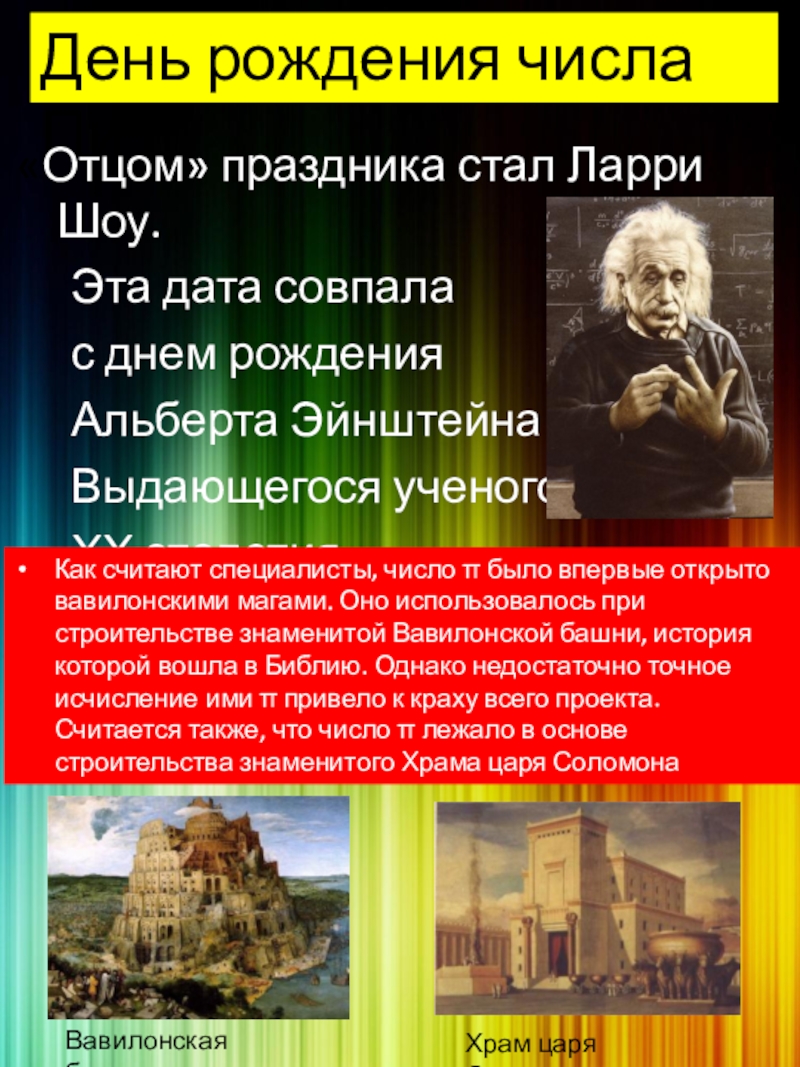 Как считают специалисты, число π было впервые открыто вавилонскими магами. Оно использовалось при строительстве знаменитой Вавилонской башни, история которой вошла в Библию. Однако недостаточно точное исчисление ими π привело к краху всего проекта. Считается также, что число π лежало в основе строительства знаменитого Храма царя Соломона