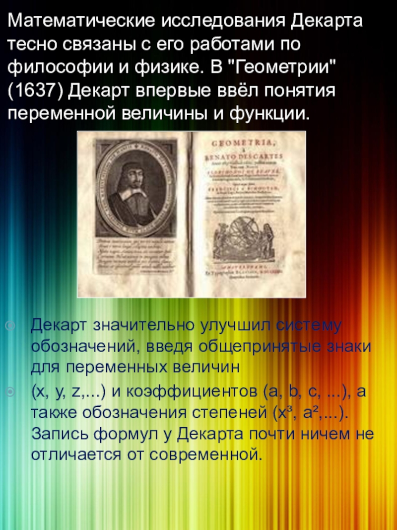 Декарт значительно улучшил систему обозначений, введя общепринятые знаки для переменных величин