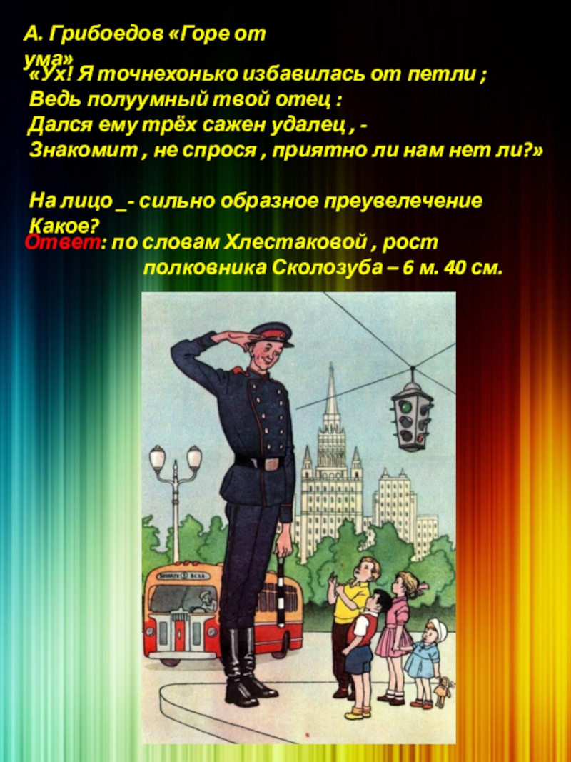 Ответ: по словам Хлестаковой , рост полковника Сколозуба – 6 м. 40 см.