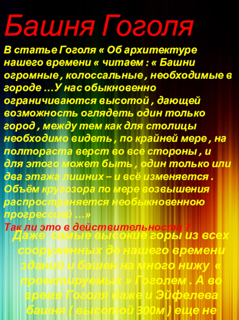 Даже самые высокие горы из всех сооруженных до нашего времени зданий и башен на много нижу « проектируемых » Гоголем . А во время Гоголя даже и Эйфелева башня ( высотой 300м ) еще не существовала .