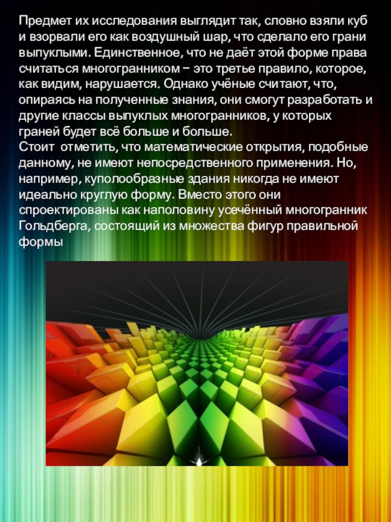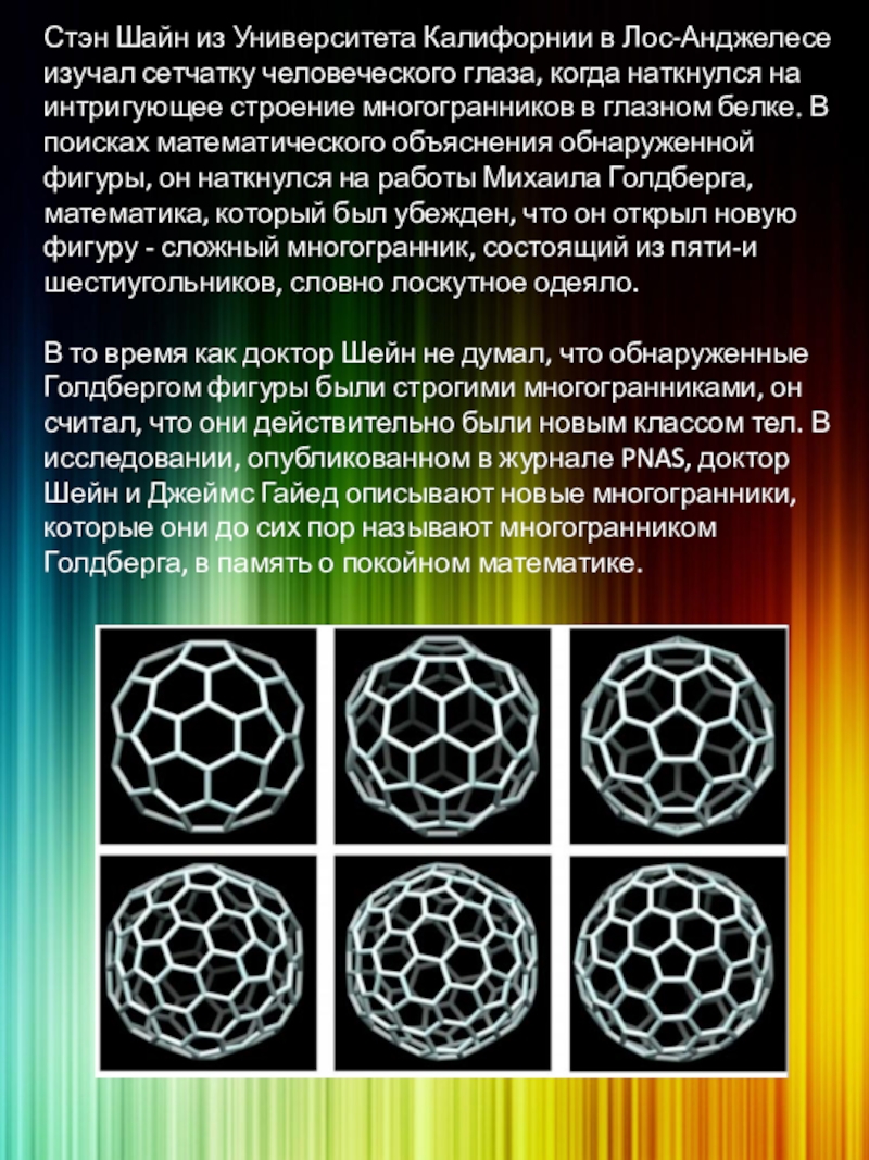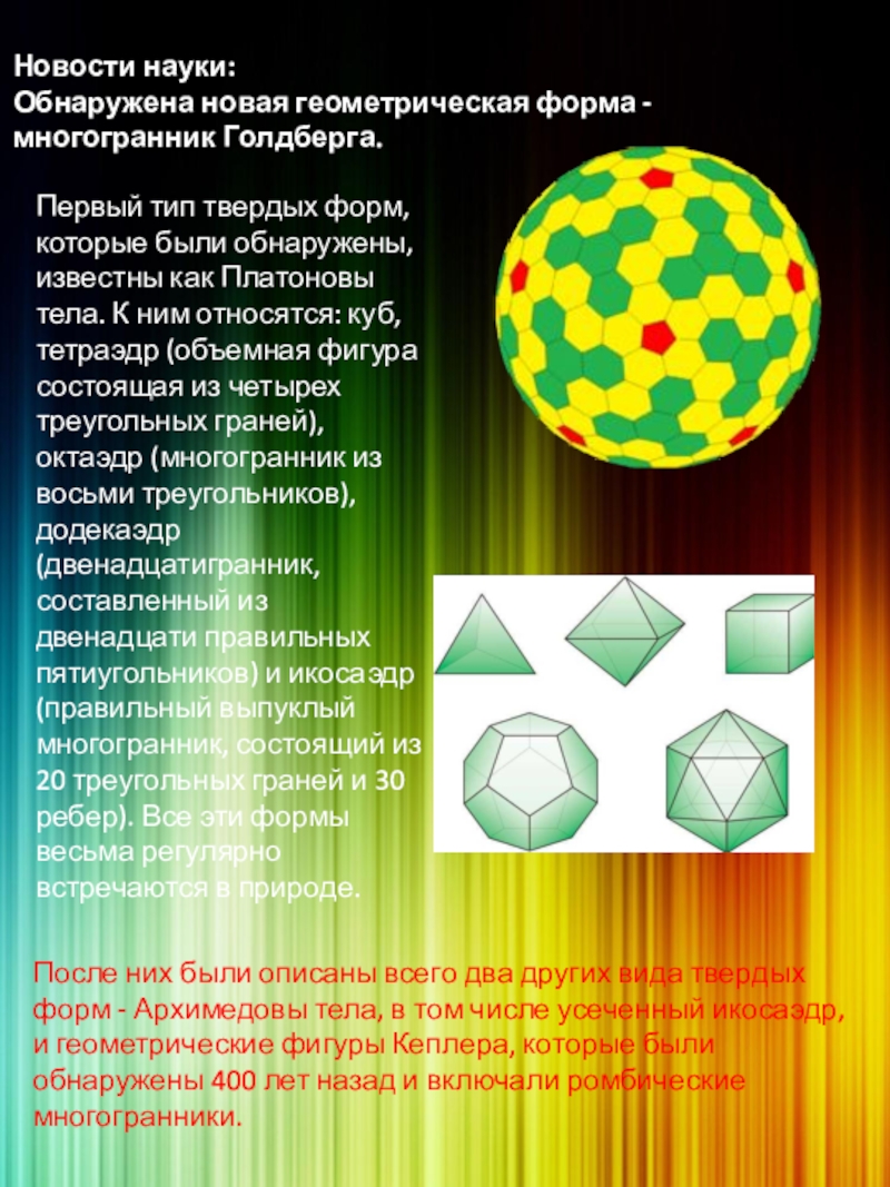После них были описаны всего два других вида твердых форм - Архимедовы тела, в том числе усеченный икосаэдр, и геометрические фигуры Кеплера, которые были обнаружены 400 лет назад и включали ромбические многогранники.