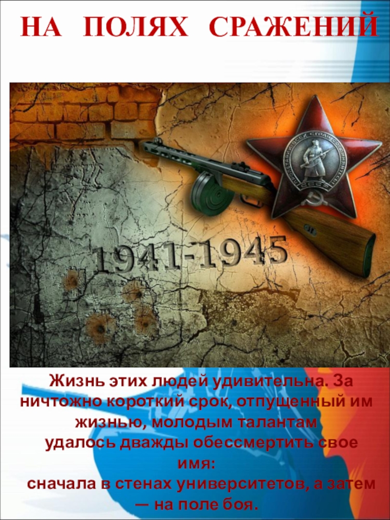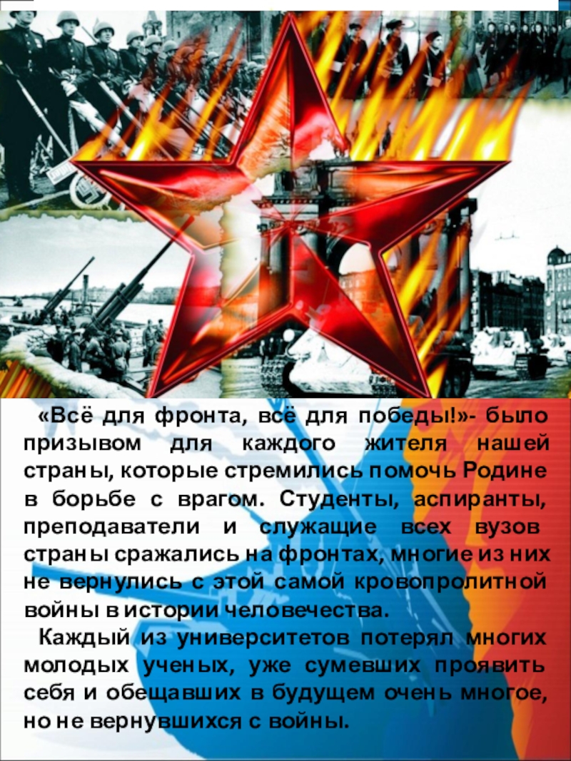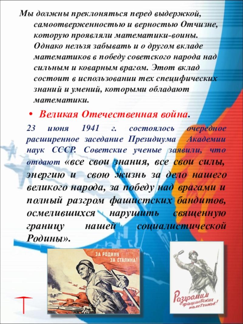 С первых дней войны математики принимали участие в защите страны: призывались в армию, записывались в народное ополчение, шли на фронт добровольцами. В самые тяжелые для страны дни они показали себя верными сыновьями Родины, способными на самопожертвование и готовыми отдать жизнь во имя свободы Отчизны. И действительно, многие из тех, кто ушел па фронт, не возвратились и не приступили к своей любимой работе. Среди погибших было много талантливых математиков, подававших большие надежды, способных внести большой вклад в прогресс наших знаний.
