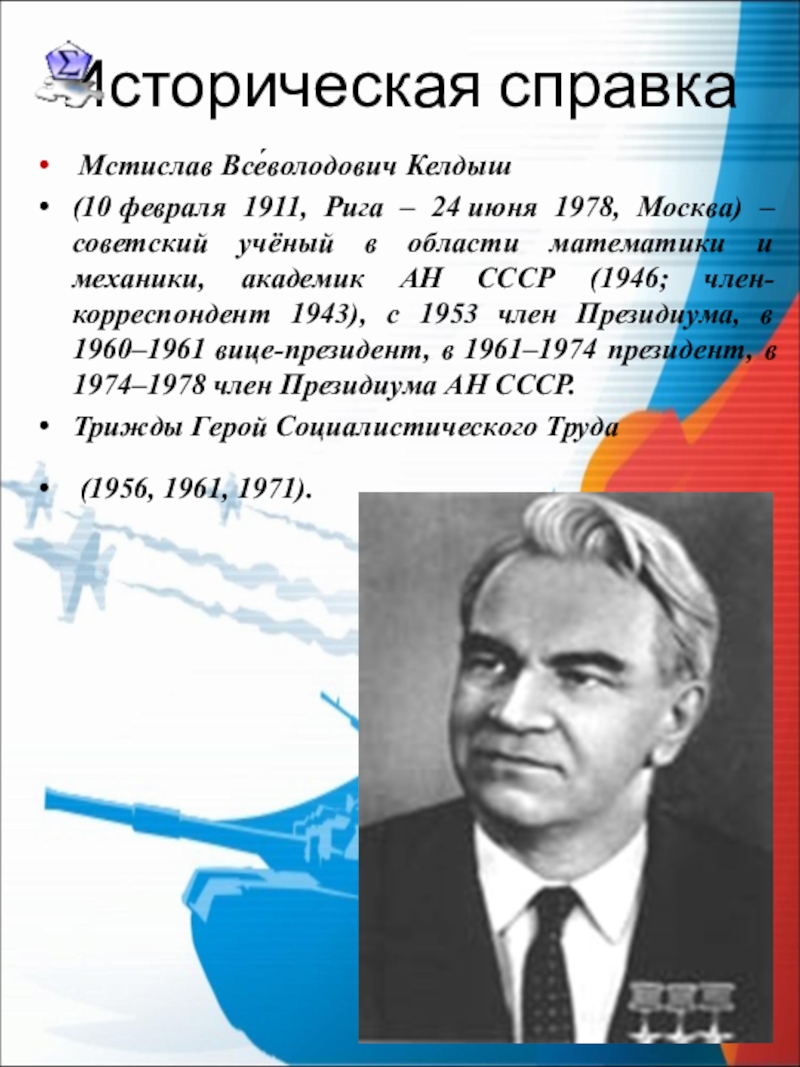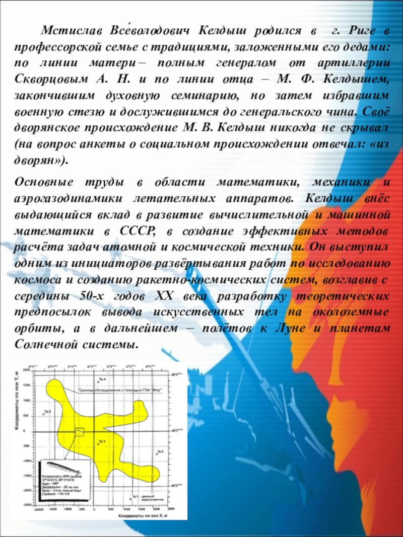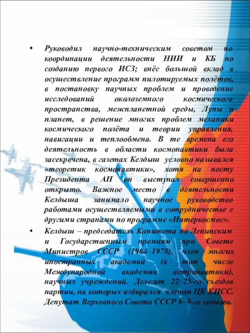 Основные труды в области математики, механики и аэрогазодинамики летательных аппаратов. Келдыш внёс выдающийся вклад в развитие вычислительной и машинной математики в СССР, в создание эффективных методов расчёта задач атомной и космической техники. Он выступил одним из инициаторов развёртывания работ по исследованию космоса и созданию ракетно-космических систем, возглавив с середины 50-х годов XX века разработку теоретических предпосылок вывода искусственных тел на околоземные орбиты, а в дальнейшем – полётов к Луне и планетам Солнечной системы.