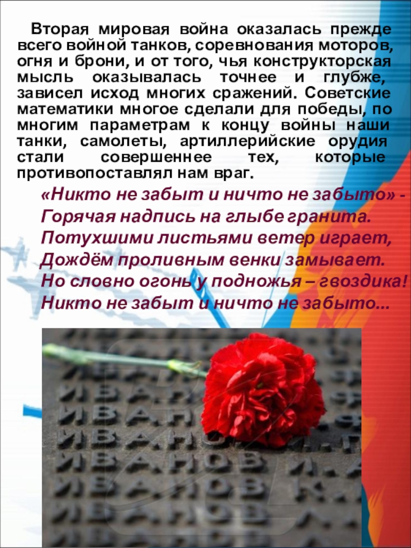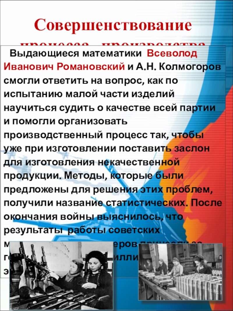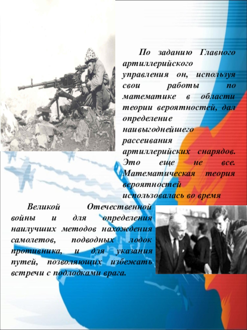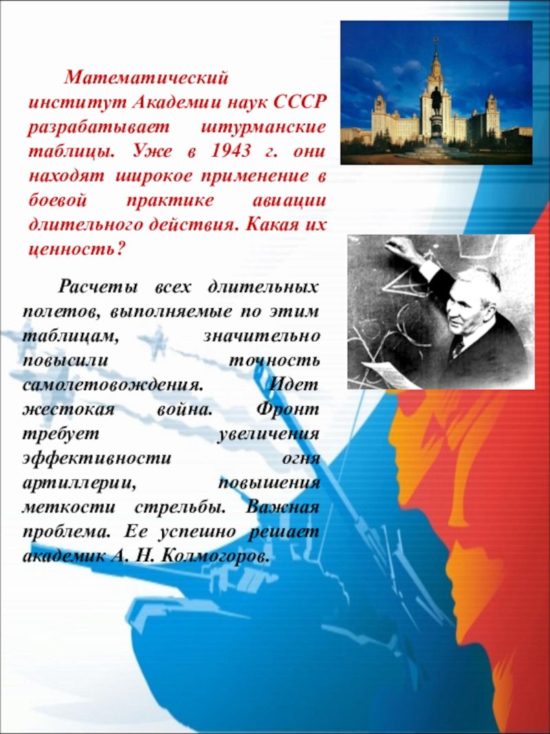 Расчеты всех длительных полетов, выполняемые по этим таблицам, значительно повысили точность самолетовождения. Идет жестокая война. Фронт требует увеличения эффективности огня артиллерии, повышения меткости стрельбы. Важная проблема. Ее успешно решает академик А. Н. Колмогоров.