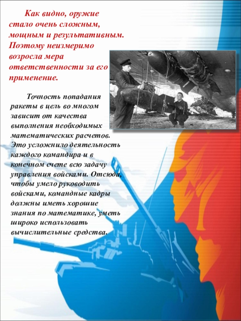 Точность попадания ракеты в цель во многом зависит от качества выполнения необходимых математических расчетов. Это усложнило деятельность каждого командира и в конечном счете всю задачу управления войсками. Отсюда, чтобы умело руководить войсками, командные кадры должны иметь хорошие знания по математике, уметь широко использовать вычислительные средства.