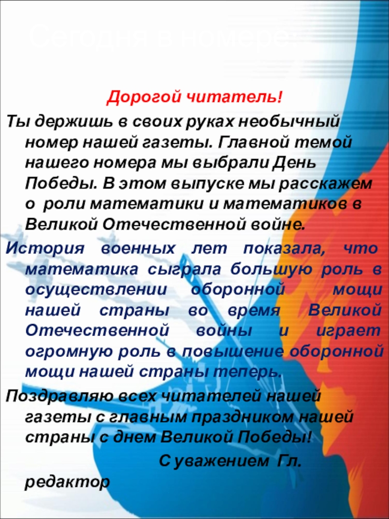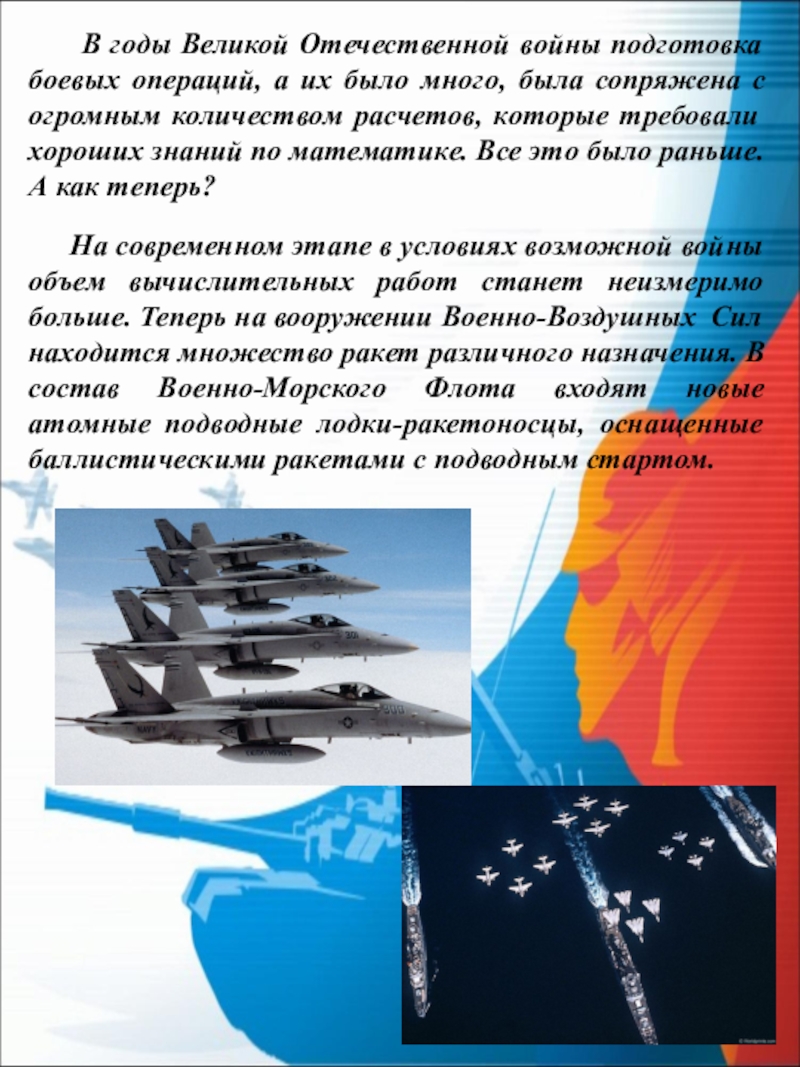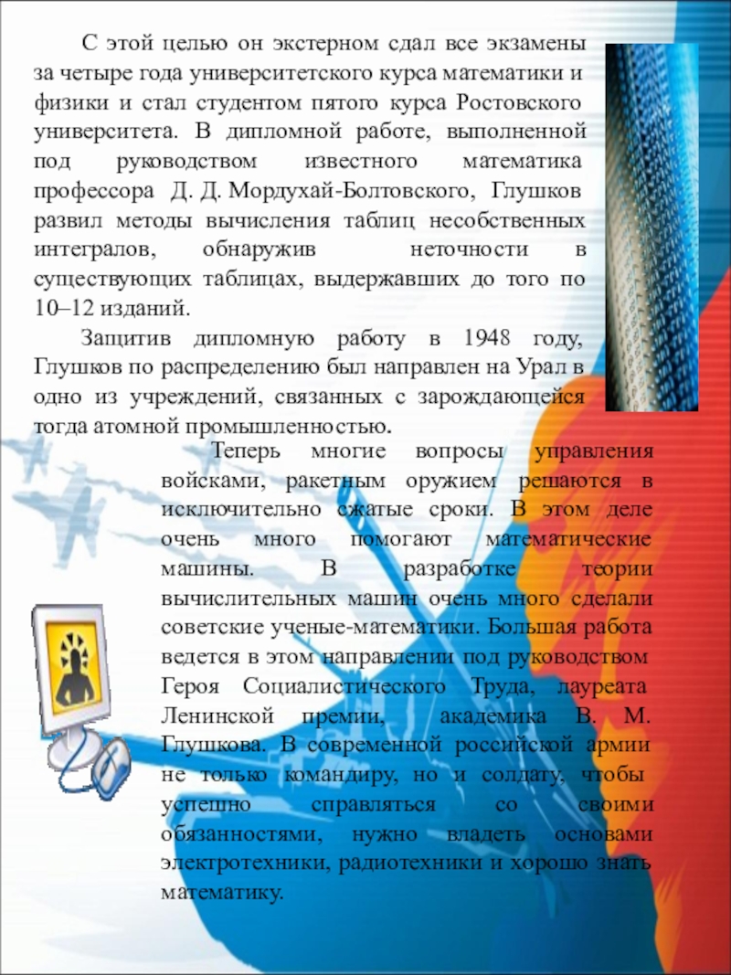 Теперь многие вопросы управления войсками, ракетным оружием решаются в исключительно сжатые сроки. В этом деле очень много помогают математические машины. В разработке теории вычислительных машин очень много сделали советские ученые-математики. Большая работа ведется в этом направлении под руководством Героя Социалистического Труда, лауреата Ленинской премии, академика В. М. Глушкова. В современной российской армии не только командиру, но и солдату, чтобы успешно справляться со своими обязанностями, нужно владеть основами электротехники, радиотехники и хорошо знать математику.
