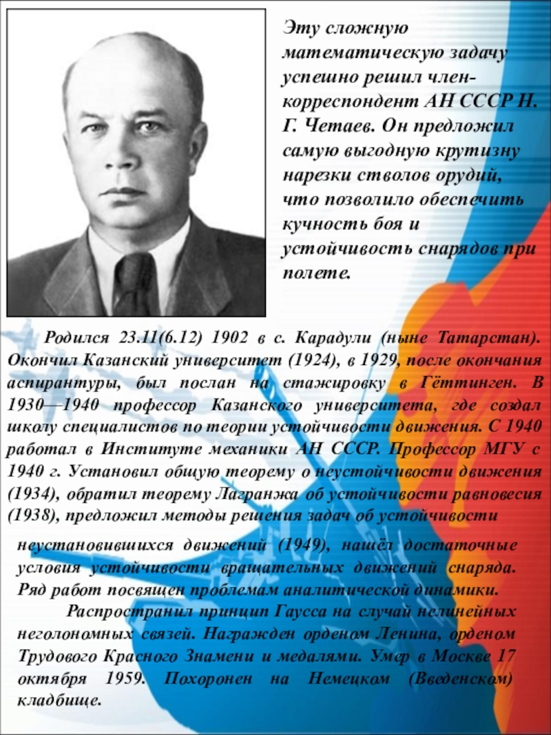 Эту сложную математическую задачу успешно решил член-корреспондент АН СССР Н. Г. Четаев. Он предложил самую выгодную крутизну нарезки стволов орудий, что позволило обеспечить кучность боя и устойчивость снарядов при полете.