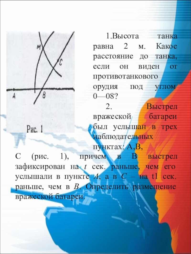 С (рис. 1), причем в В выстрел зафиксирован на t сек. раньше, чем его услышали в пункте А, а в С – на t1 сек. раньше, чем в В. Определить размещение вражеской батареи.