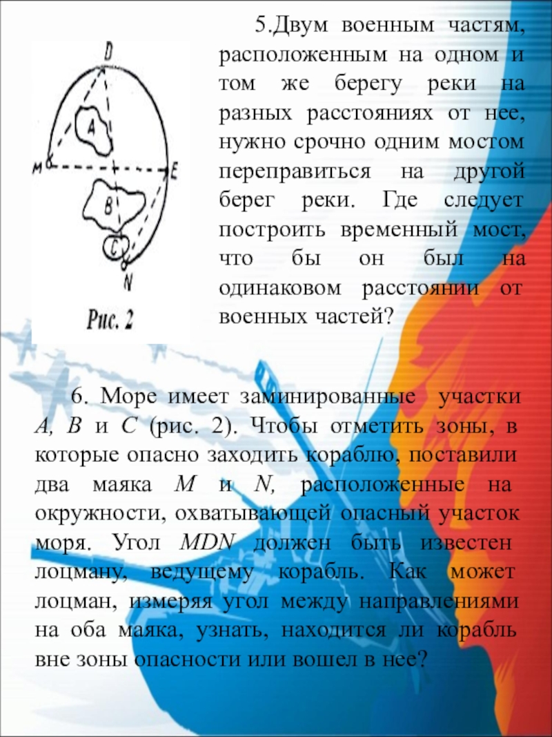 6. Море имеет заминированные участки А, В и С (рис. 2). Чтобы отметить зоны, в которые опасно заходить кораблю, поставили два маяка М и N, расположенные на окружности, охватывающей опасный участок моря. Угол MDN должен быть известен лоцману, ведущему корабль. Как может лоцман, измеряя угол между направлениями на оба маяка, узнать, находится ли корабль вне зоны опасности или вошел в нее?
