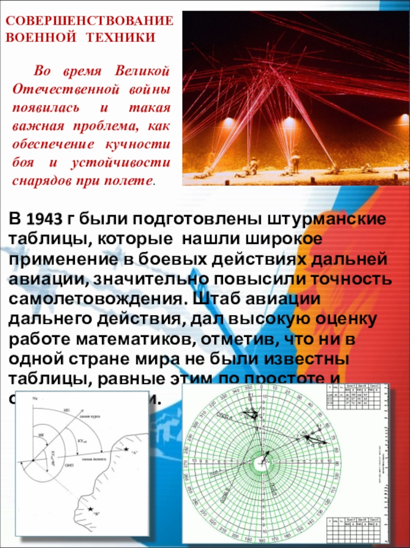 В 1943 г были подготовлены штурманские таблицы, которые нашли широкое применение в боевых действиях дальней авиации, значительно повысили точность самолетовождения. Штаб авиации дальнего действия, дал высокую оценку работе математиков, отметив, что ни в одной стране мира не были известны таблицы, равные этим по простоте и оригинальности.