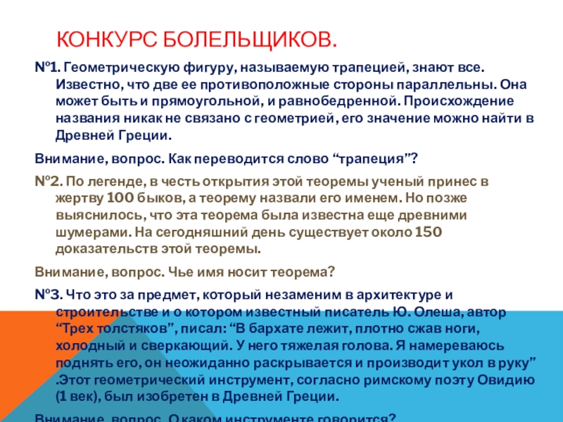 №3. Что это за предмет, который незаменим в архитектуре и строительстве и о котором известный писатель Ю. Олеша, автор “Трех толстяков”, писал: “В бархате лежит, плотно сжав ноги, холодный и сверкающий. У него тяжелая голова. Я намереваюсь поднять его, он неожиданно раскрывается и производит укол в руку” .Этот геометрический инструмент, согласно римскому поэту Овидию (1 век), был изобретен в Древней Греции.