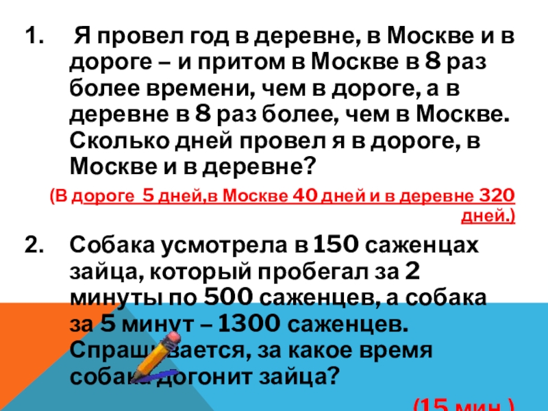 – и притом в Москве в 8 раз более времени, чем в дороге, а в деревне в 8 раз более, чем в Москве. Сколько дней провел я в дороге, в Москве и в деревне?